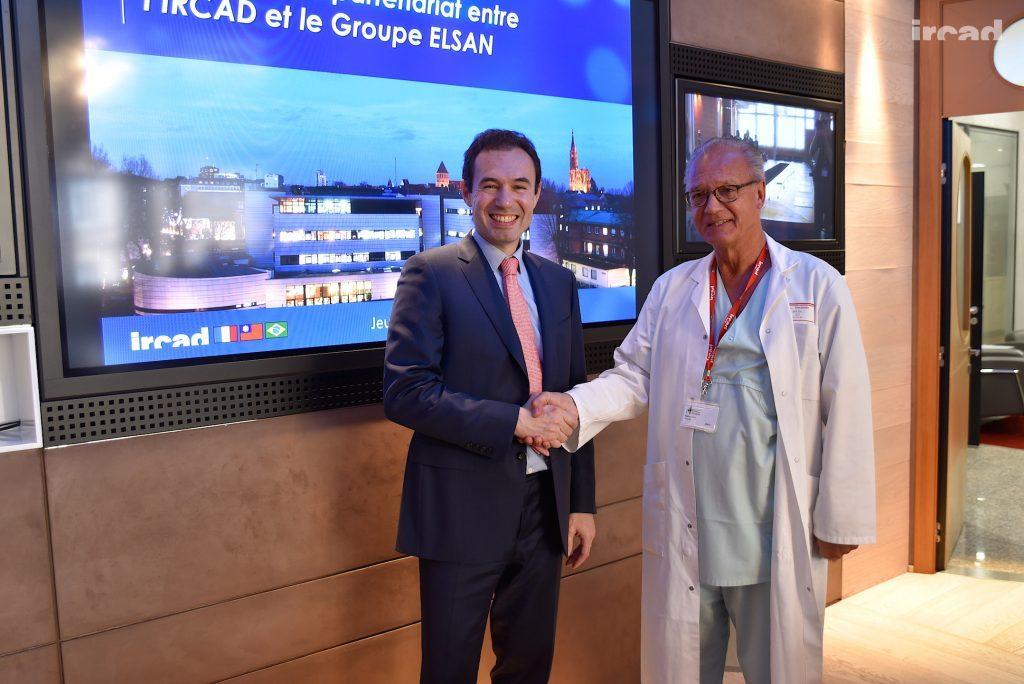 Professor Jacques MARESCAUX, President of IRCAD, and Mr Jérome NOUZAREDE, President of the ELSAN Group, officially signed a partnership today between the two structures, in