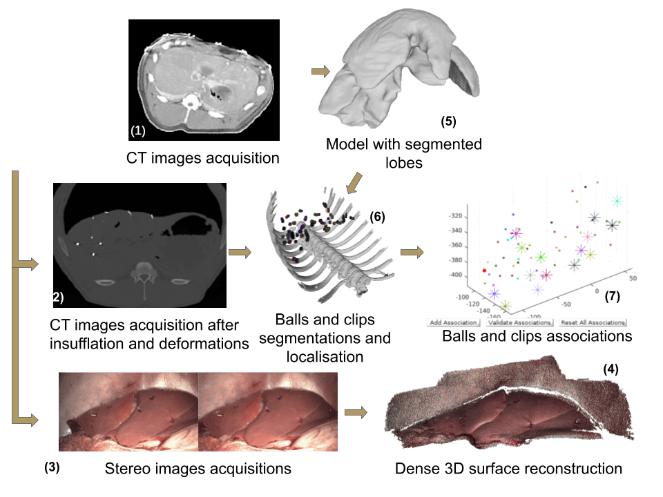One reference configuration with a pre-operative CT (without insufflation) is given. Two reference 3D models are provided (one with the lobes of the liver segmented and one without). There are 13 infra-operative configurations to test the registration. In all these configurations, metal markers (clips on the surface, and spheres inside the lobes) are present and localized using intra-operative CT.